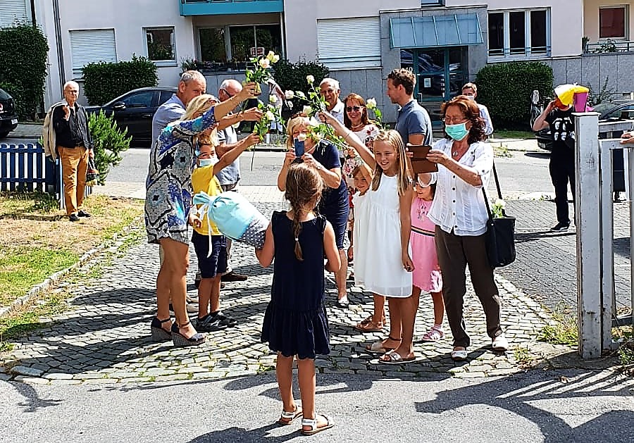 Nach der Einschulungsfeier gab es für unsere Neulinge eine große Überraschung, da zahlreiche Großeltern, weitere Familienmitglieder und Freunde in einer langen Reihe vor dem Tor ihre Lieben in Empfang nahmen, da sie diesmal nicht persönlich bei der Feier anwesend sein konnten. Der Kreativität waren keine Grenzen gesetzt, so wurde unser einfaches Schultor z.B. in ein Rosenspalier verwandelt.